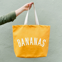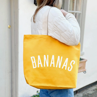 The perfect everyday tote for sunshine lovers everywhere! These big canvas bags make the perfect spacious totes for your daily essentials and much more. The ideal bright and cheerful beach bag for your summer holiday! This playful 'BANANAS' design is printed in off-white on sturdy, sunshine yellow canvas.