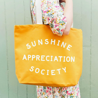 The perfect everyday tote for sunshine lovers everywhere! These big canvas bags make the perfect spacious totes for your daily essentials and much more. The ideal bright and cheerful beach bag for your summer holiday!  This hand illustrated 'Sunshine Appreciation Society' design has been printed in off-white on sturdy sunny yellow canvas.