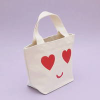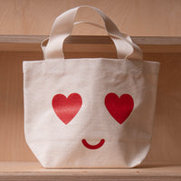 The heart eyes design has been screen printed in red on sturdy natural canvas.