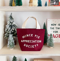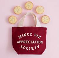 Grab this mini tote bag for your festive essentials and become a member of the society celebrating (arguably) the best Christmas snack ever! Fill with mince pies and other festive treats to make the perfect mini Christmas hamper. Also makes a beautiful reusable gift bag for true mince pie aficionados! 'Mince Pie Appreciation Society' design has been screen printed in off-white on sturdy canvas.
