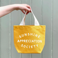 This hand illustrated 'Sunshine Appreciation Society' design has been printed in off-white on sturdy yellow canvas.