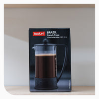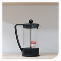 Eight cup Cafetière (also known as a French Press) produced by the renowned Danish kitchenware brand Bodum.