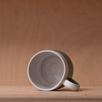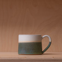 Wheel thrown in warm buff clay. These mugs have a gloss white celadon interior, and a matte white & bluey green dipped exterior. The glaze on each is individual, and depending on the position in the kiln, some have warmer cream/sandy colouring on sections of the white glaze.