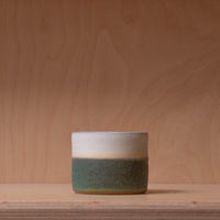 Wheel thrown in warm buff clay. These mugs have a gloss white celadon interior, and a matte white & bluey green dipped exterior. The glaze on each is individual, and depending on the position in the kiln, some have warmer cream/sandy colouring on sections of the white glaze.