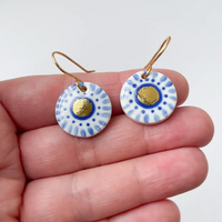 White round dangle earrings with blue dot decor and gold lustre centre on gold plated wire.