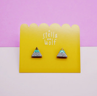 These wooden triangle earrings have been hand painted in pastel turquoise and white and have a contemporary black spotty design. They have been decorated with a touch of gold leaf and are finished with a resin to give a high gloss finish.