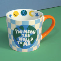 You know that favourite mug you have in your cupboard, well move it over as this could be your new favourite! Featuring a sky blue checkerboard pattern and colour pop orange handle, the mug has an illustrated world with the message 'You mean the world to me' across it.