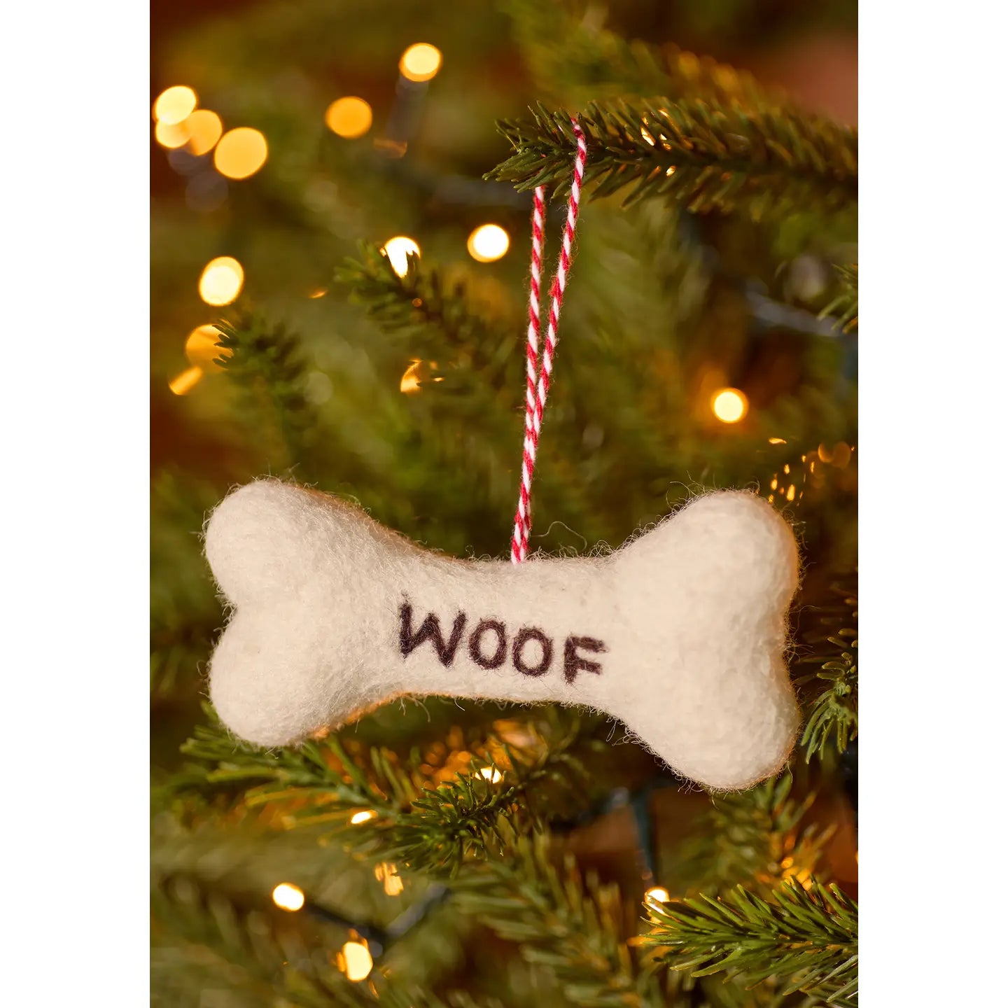 A wool felt bone-shaped hanging decoration with a 'WOOF' message. Fitted with a red and white hanging thread. From a new range of sustainable eco-friendly Christmas decoration ideas designed in-house at Namaste.