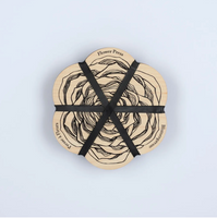 Maple veneered FSC board - Card and paper circles - Silicone Rubber bands to avoid loss of elasticity Packaging - Info card fastened to back of each press with product image and ‘how to use’ information. .